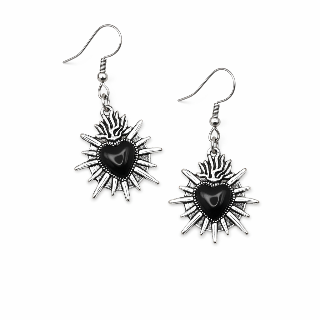 Aretes de Sagrado Corazón con rayos plateados que lo protegen.